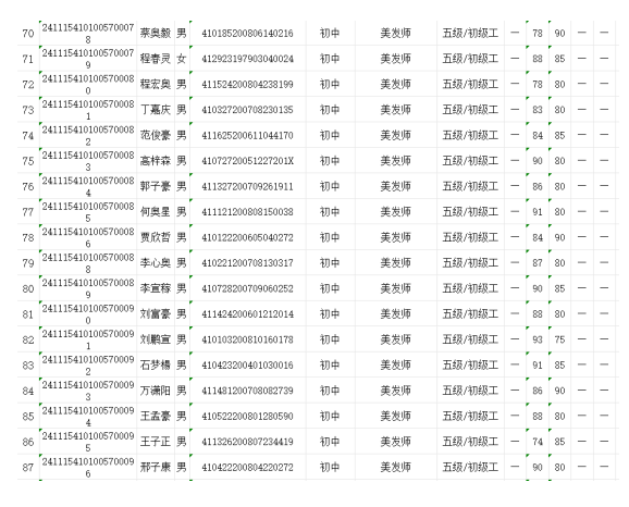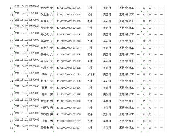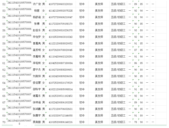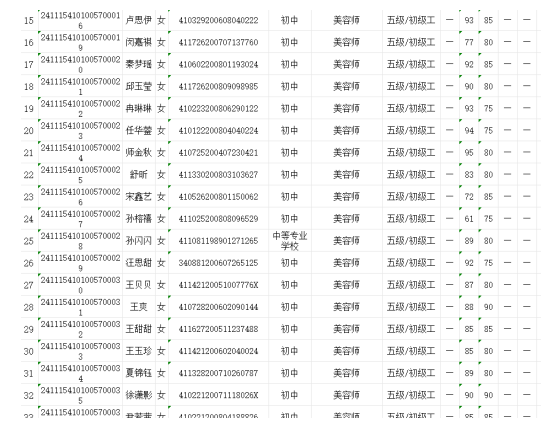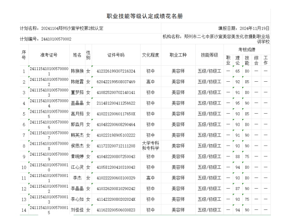 按照省市職業(yè)技能鑒定指導中心社會培訓評價組織職業(yè)技能等級認定工作要求,結(jié)合本機構(gòu)實際工作,鄭州市二七中原沙宣美容美發(fā)化妝攝影職業(yè)培訓學校于2023年12月23日進行了美容師(五級/初級工)職業(yè)技能等級認定評價考核,共24人合格(明細詳見下圖),根據(jù)職業(yè)技能等級認定工作流程要求,特將認定結(jié)果予以公示。