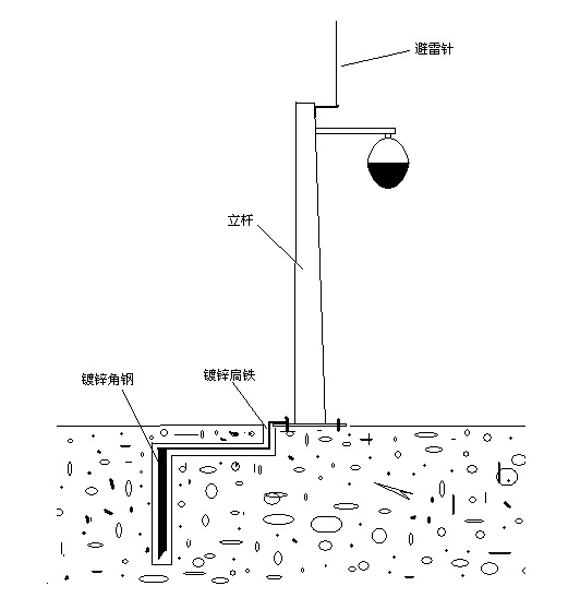 具體設(shè)計(jì)方案為:在室外各攝像頭的立桿上(立桿的頂部)分別安裝一支避雷針,規(guī)格為φ15×500mm鍍銅避雷針PTZ-0.5,安裝方式為焊接,如圖所示。